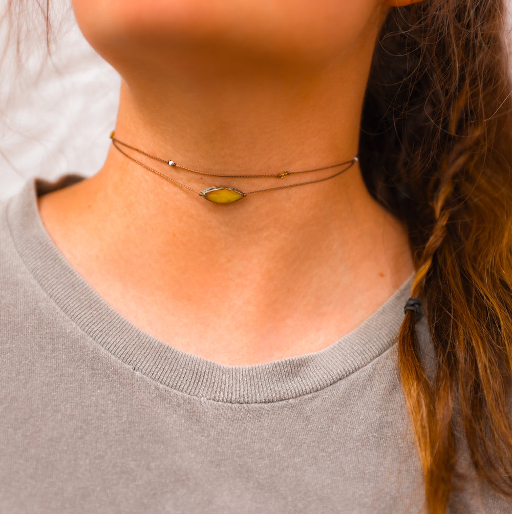 This double layered choker necklace features a semi-translucent mustard yellow petal pendant with rustic brown edging on our dainty waterproof cord. Tiny baby blue and yellow glass beads accent the upper strand, beautifully complementing the boho focal piece.