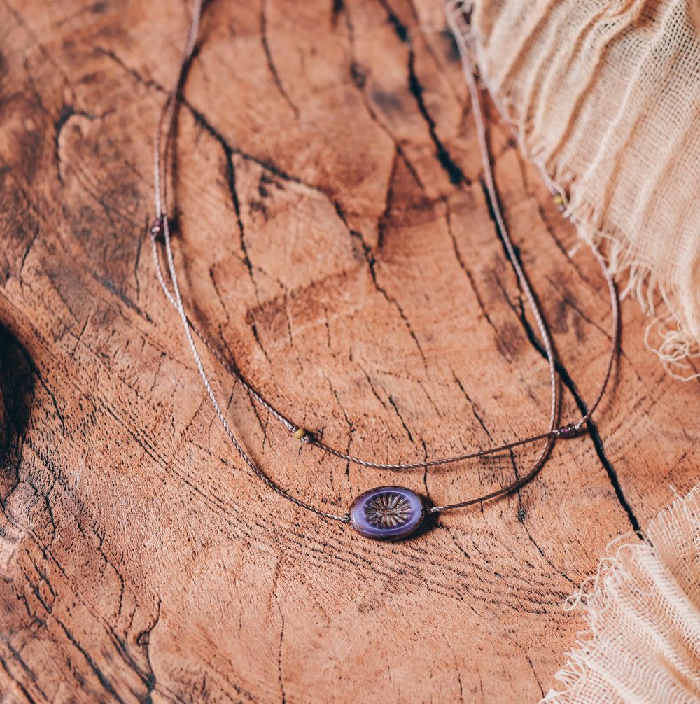 This double layered choker necklace features a deep vintage purple glass oval pendant with an etched flower center on our dainty waterproof cord. Tiny olive green and purple glass beads accent the upper strand, adding an eclectic touch.