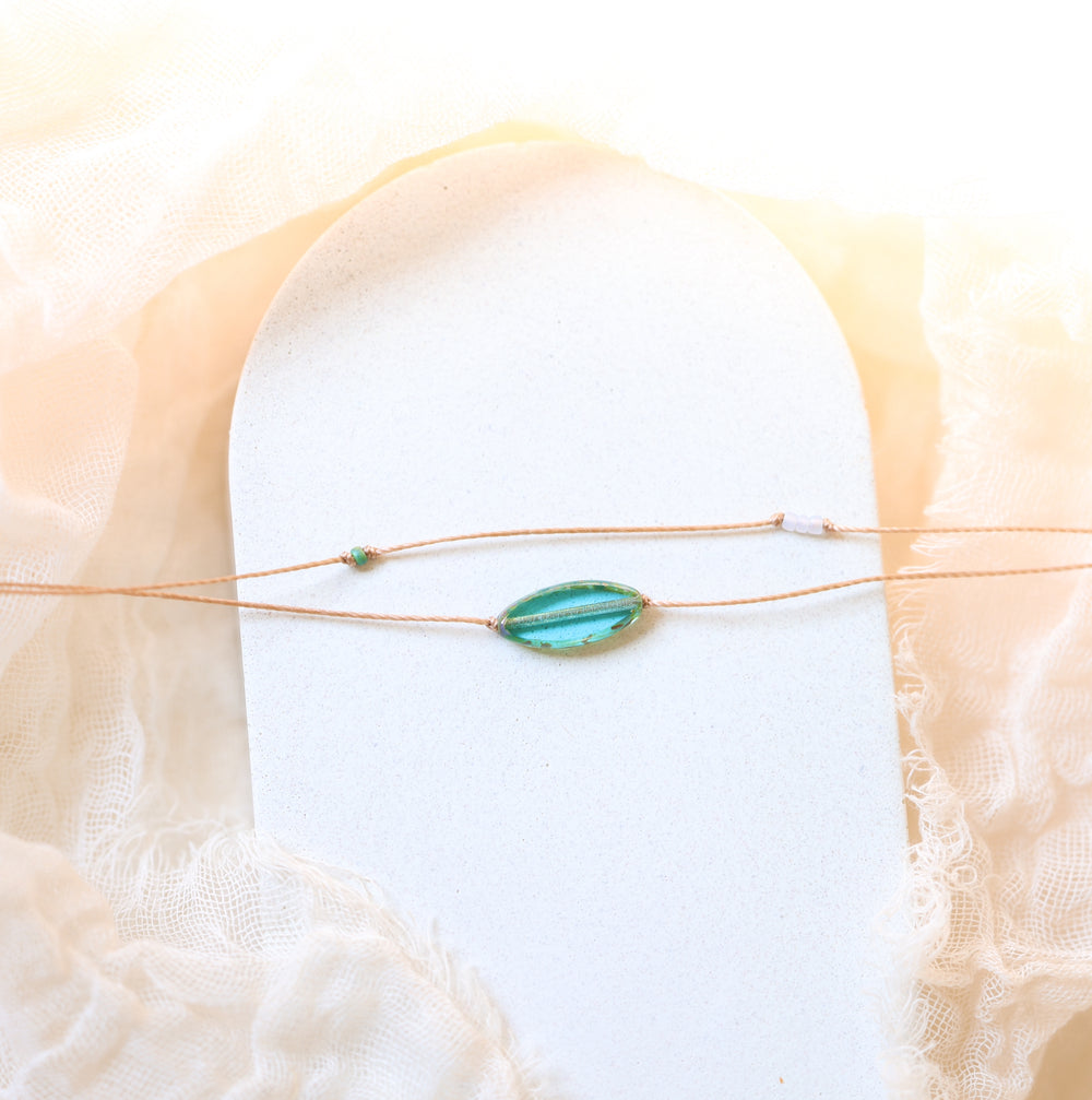 This double layered choker necklace features a translucent oceanic teal blue pendant on our bronze waterproof cord. Tiny earthy teal and pastel blue glass beads accent the upper strand. The perfect necklace for a day at the beach.