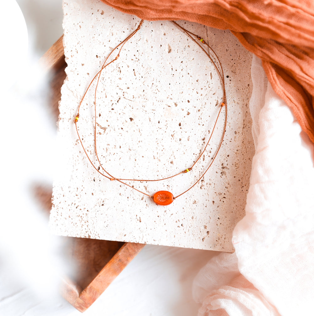 Embrace the sun's warmth with our double layered flower necklace. It features a vibrant orangish-red glass oval bead with a beautiful flower/sun imprint at its center, radiating cheerful energy. The delicate strands are accented with tiny earthy green and orange seed beads along the cord. Perfect for your next summer festival or adding an eclectic touch to your rustic fall look.