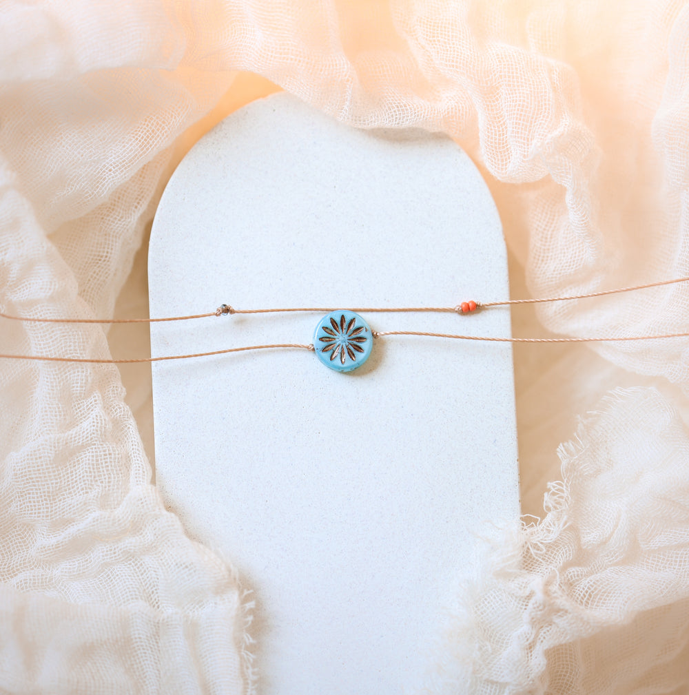 This double layered choker features a light pastel blue glass coin with an etched bronze flower at its center. Accented with tiny glass seed beads knotted along the waterproof cord, it’s a perfect piece for any bohemian-western look.
