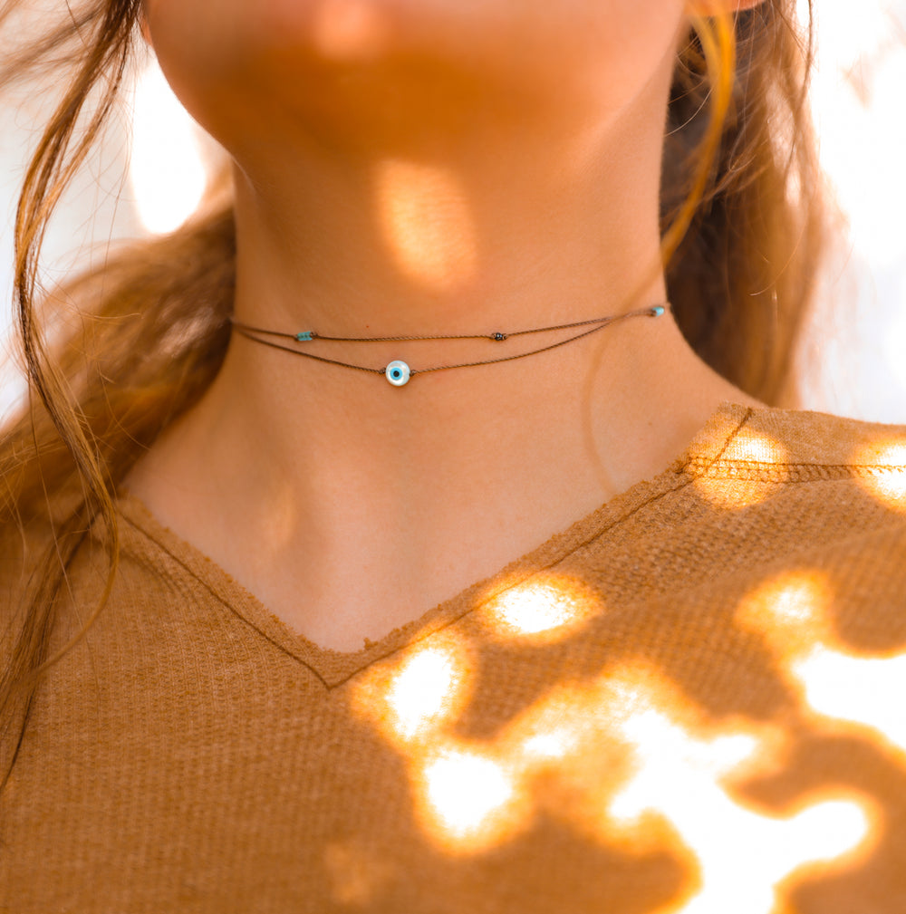 Inspired by the traditional Turkish Nazar, this double layered evil eye necklace is the perfect mix of cute and quirky. It features a small evil eye charm made from mother of pearl gemstone on our waterproof cord, with tiny blue glass seed beads knotted along the strand. It's a fun and quirky choker that's great for everyday wear, making it an awesome gift for yourself or someone special.