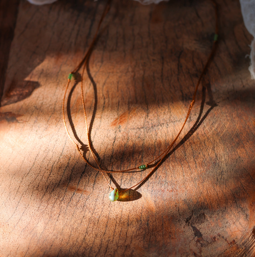Check out this lovely hippie layered necklace! It features a beautiful abstract earthy glass teardrop at the center, showcasing a unique green hue with subtle hints of brown and dusty blue on our waterproof cord. The upper strand has tiny glass seed beads, playfully knotted in shades of green and brown. It’s a cute choker that’s perfect for everyday wear and fits right in with any bohemian or Western-style jewelry collection.