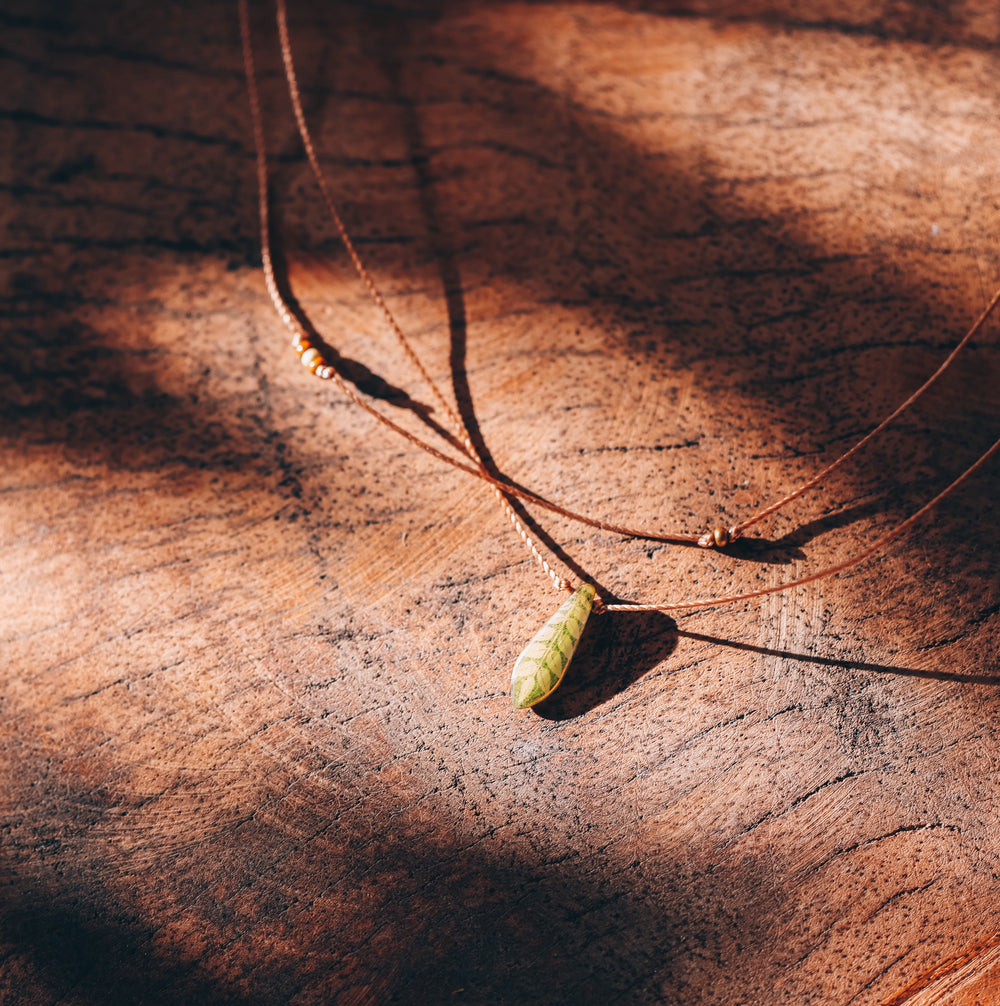 This unique little hippie necklace features a striking glass dagger pendant on a layered waterproof cord. The green dagger showcases stunning leaf detailing on both sides, adding a beautiful touch. Along the upper strand of the choker, delicate glass seed beads are thoughtfully knotted, highlighting shades of green, brass, and brown. This piece is sure to elevate your earthy cottagecore-inspired outfit!