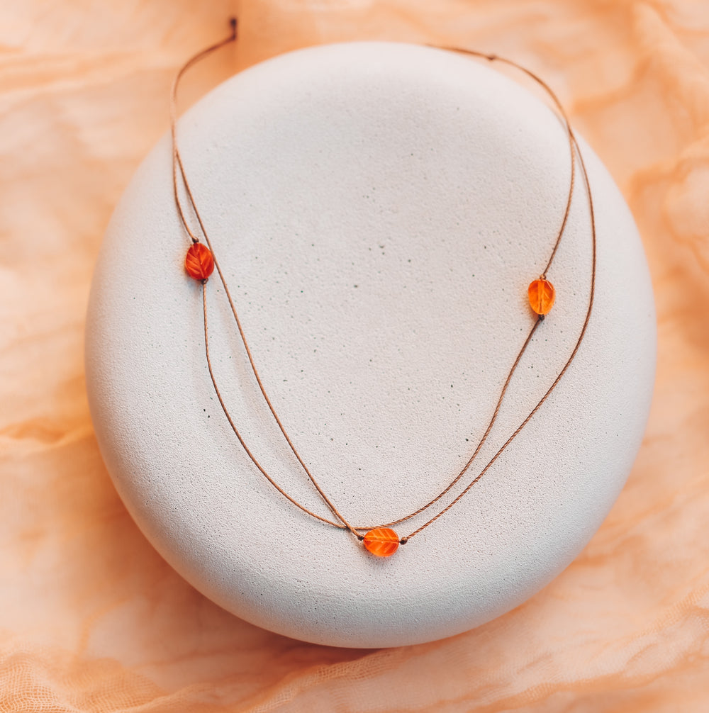 Check out this lovely double layered choker necklace. It features three beautiful carnelian gemstones carved into delicate leaf charms, all strung on our mocha waterproof cord. This unique piece adds a special touch to any outfit and is sure to catch some eyes. Perfect for layering or wearing solo, it’s a must-have for any carnelian crystal lover.
