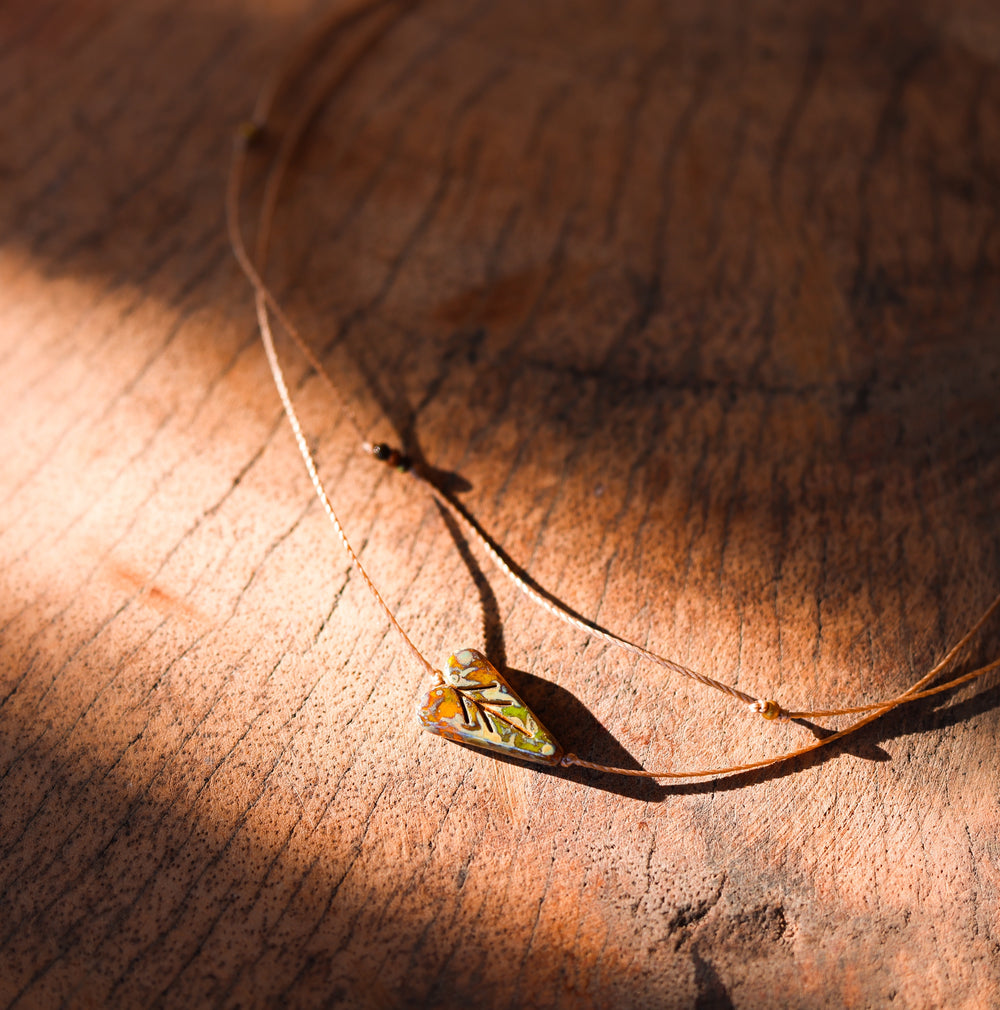 This nature-inspired layered necklace is a must-have for any cottagecore or whimsical hippie jewelry lover. It showcases a unique abstract glass heart leaf charm pendant on a tan waterproof cord. Delicate tiny glass seed beads are thoughtfully spaced along the upper strand, enhancing its eclectic bohemian vibe.  Please note, each leaf pendant may vary in color patterns.