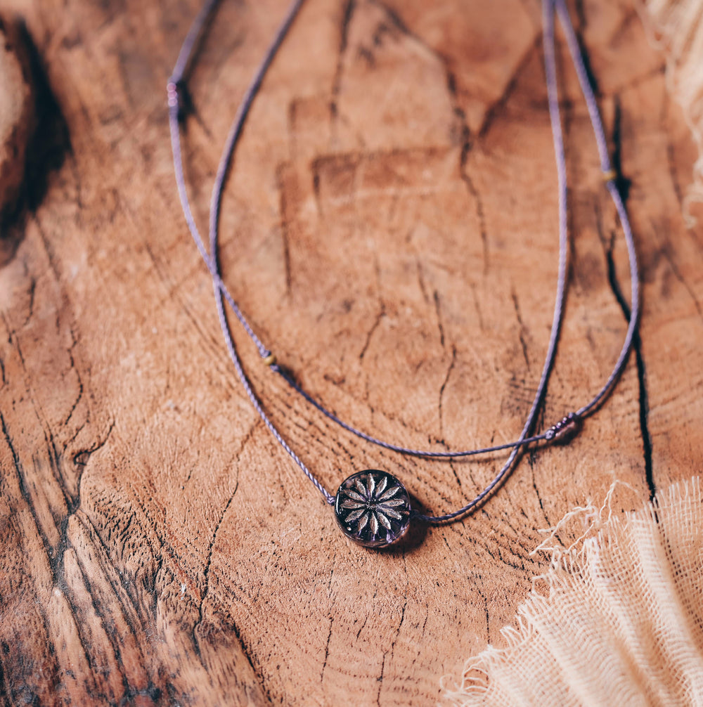 A muted lilac glass coin pendant, etched with a silver flower-star at its center, glows on this double layered choker necklace. Tiny olive green and lilac purple glass beads knot the upper strand of our dainty waterproof cord.
