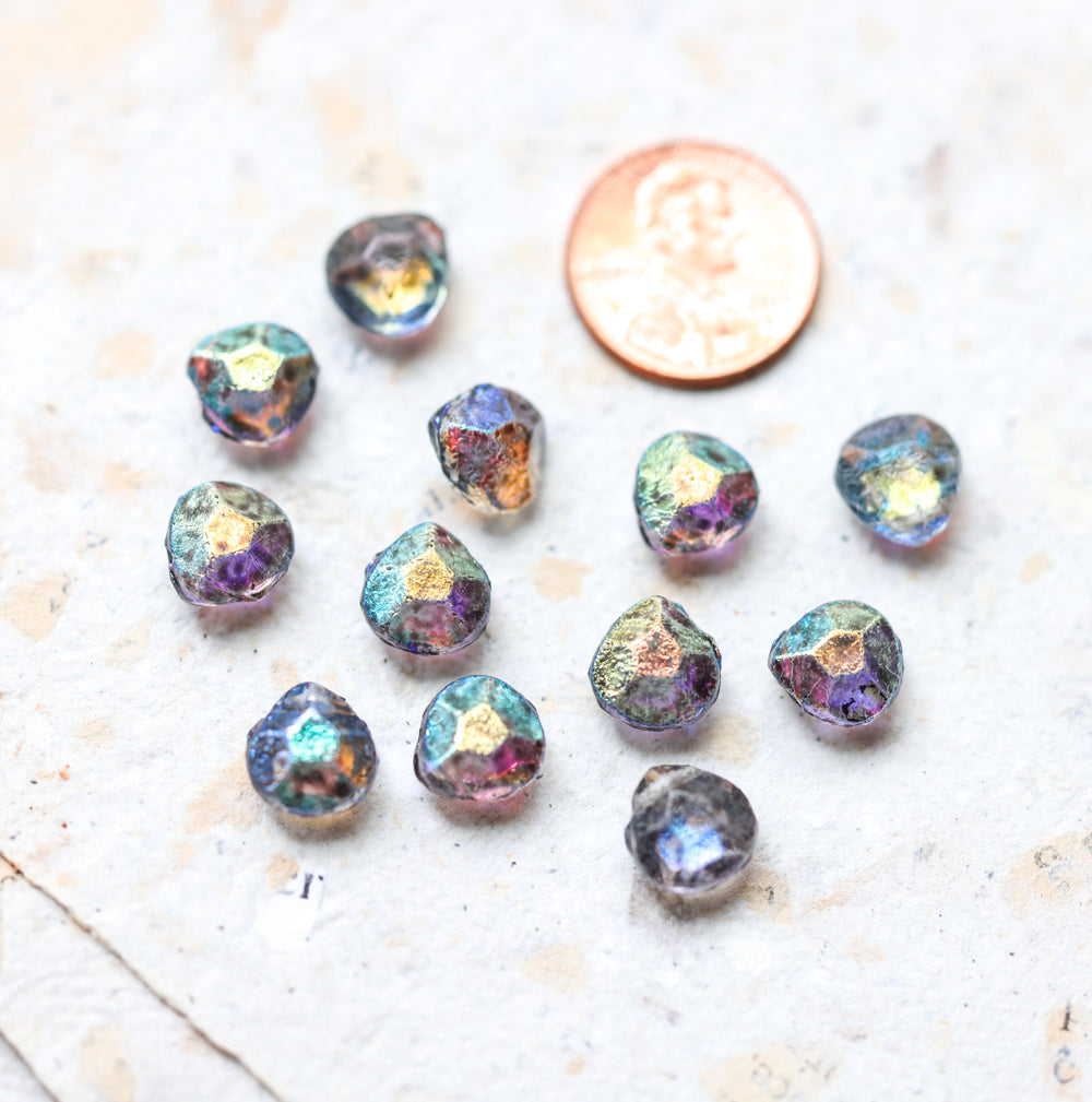 Olive green and pale blue seed beads are knotted across the upper strand of this double layered choker necklace. A double-sided iridescent drop, shimmers with deep blue, gray and teal on our bronze waterproof cord.