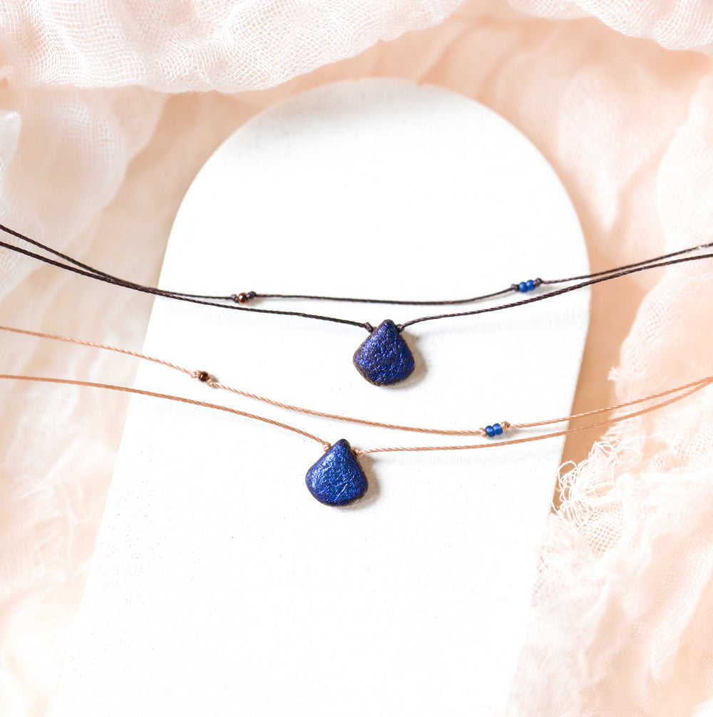 A textured, iridescent edgy blue glass teardrop pendant shimmers like a cosmic spark on our dainty waterproof cord. Tiny blue and bronze glass seed beads accent the upper strand of this double layered choker necklace, adding an eclectic touch.