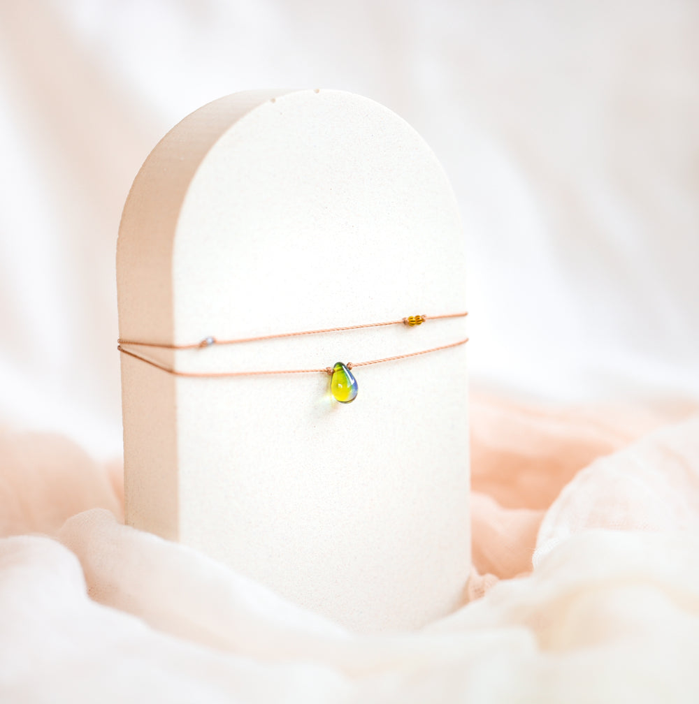 Meet the OASIS necklace, a beautiful double layered necklace that brings the serene beauty of nature right to your wardrobe. The glass teardrop pendant features calming shades of moss green and indigo blue, capturing the essence of tranquil earthy vibes. Tiny, delicate beads line the strands, adding a touch of eclectic, hippie charm. It's the perfect choker for everyday wear, serving as a gentle reminder of the beauty that surrounds us all.