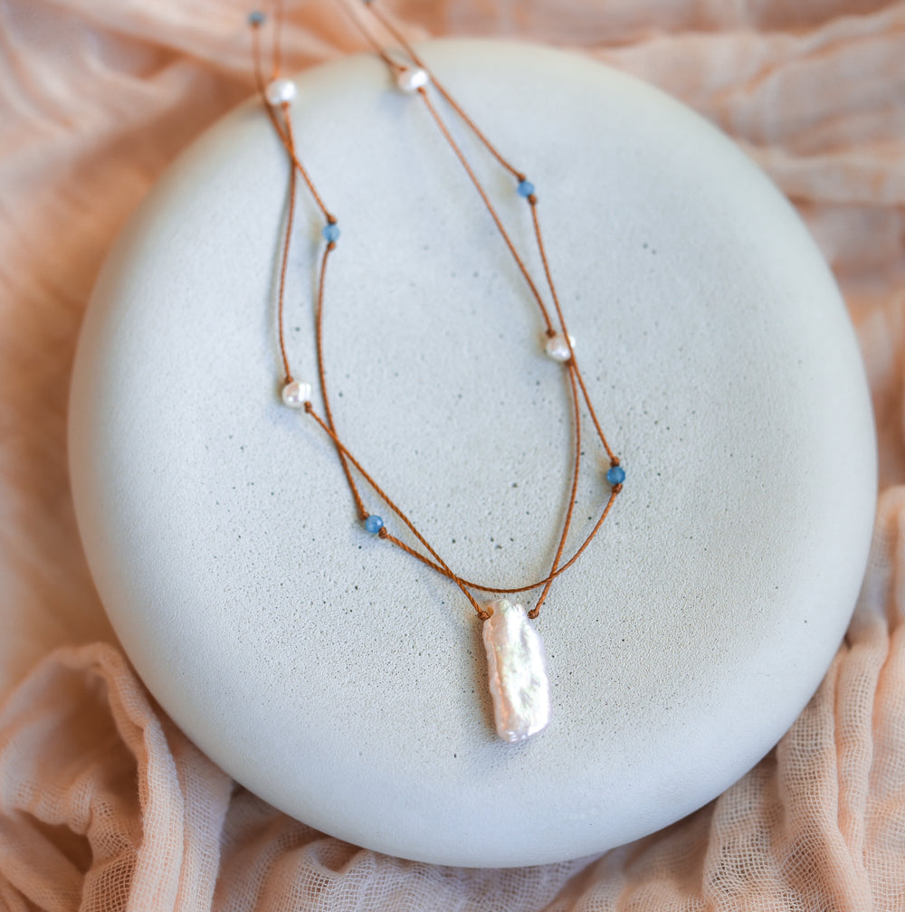 The perfect layering necklace, this stunning piece showcases two layers of waterproof cord, featuring a unique freshwater pearl pendant as the centerpiece. Dainty aquamarine and pearl gemstones are beautifully accented along the length of the strands. This necklace adds a perfect bohemian vibe to any outfit. The best part? It’s fully adjustable from 13 to 24 inches with its handy sliding knot closure. It's finished with a short backdrop and a charming copper embellishment to complete the look.