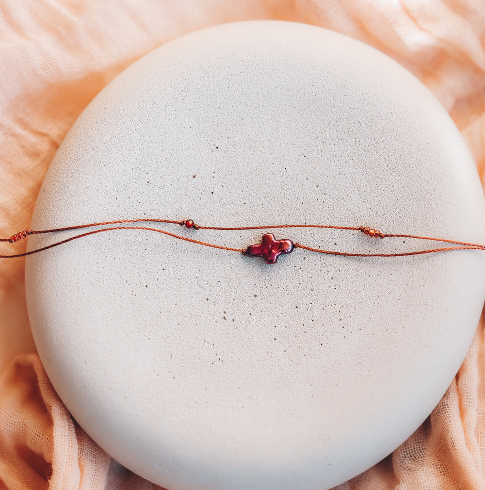 Make a statement with this one of a kind cross necklace. Handmade with our delicate waterproof cord in a layered design, it features a stunning purple freshwater pearl cross pendant at its center. Along the layered strands, tiny red garnet gemstones and copper glass seed beads are spaced evenly apart, adding a whimsical touch. This unique piece makes a thoughtful gift for a Christian friend who loves anything bohemian-hippie styled.