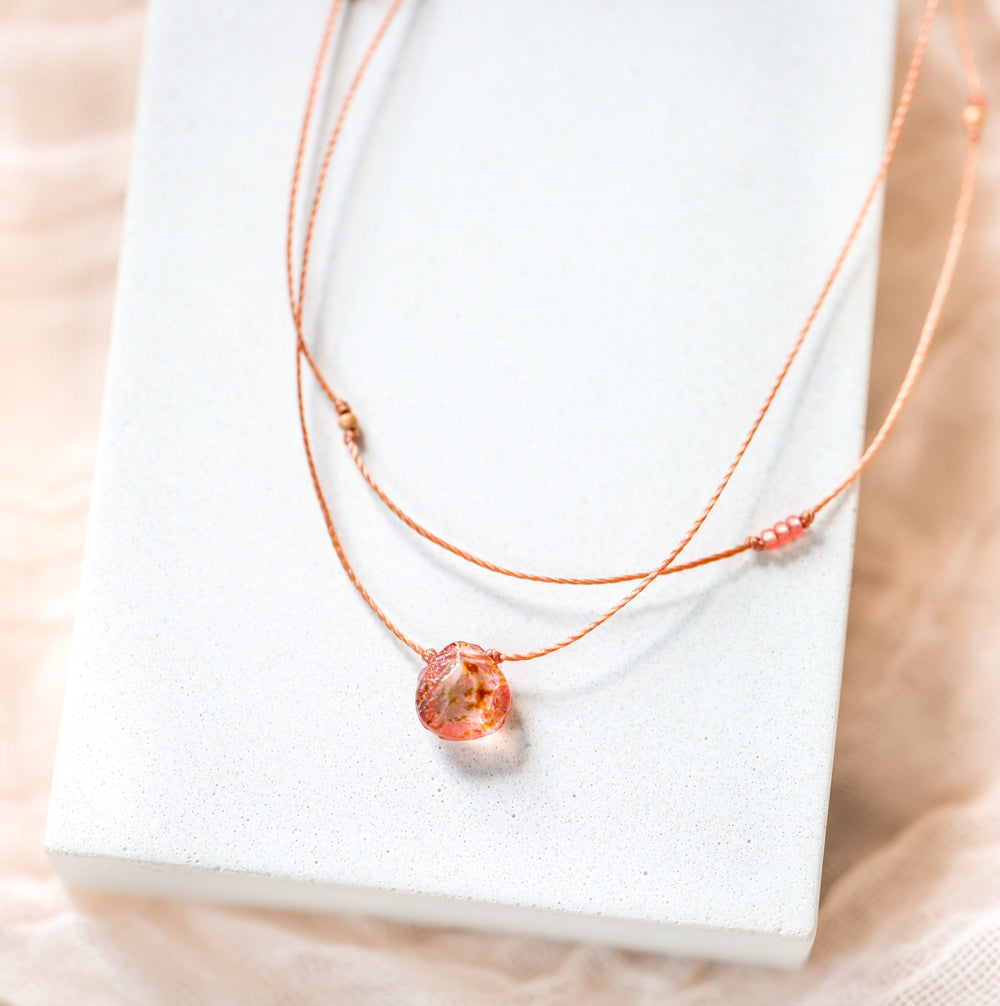 This double layered choker necklace showcases a rust rose teardrop pendant with subtle earthy brown hues. Tiny orangish-pink and golden brown seed beads grace the upper strand of the dainty waterproof cord.