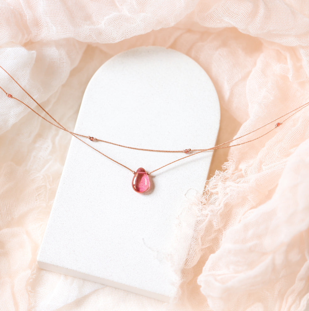 This double layered choker necklace features a translucent blush rosy pink glass teardrop pendant on our dainty waterproof cord. Tiny blush glass seed beads are knotted along the upper strand for a whimsical look.