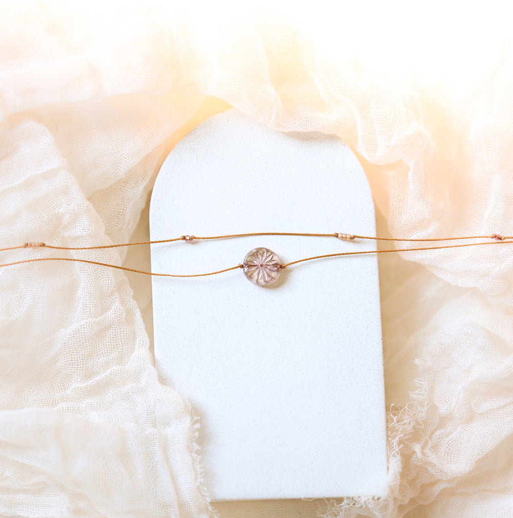 This necklace highlights a rosy pink glass coin at its center, engraved with a delicate flower detail. Tiny blush pink and champagne-colored glass seed beads are intricately knotted along the waterproof cord, adding a whimsical touch.