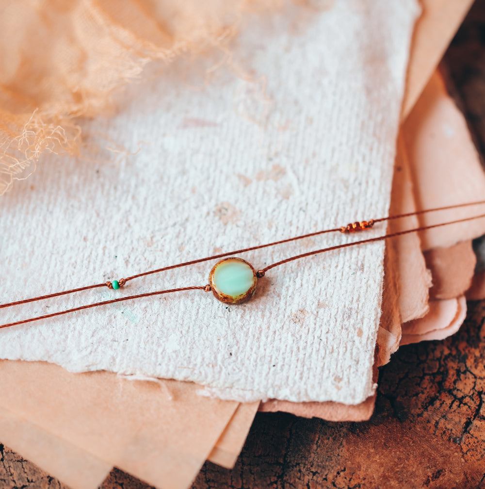 This earthy necklace features a rustic green-blue glass coin pendant on a waterproof cord. Tiny brown and turquoise glass seed beads are knotted along the length of the upper strand.