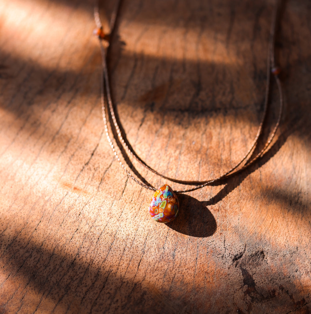 Check out this cute hippie tie dye double layered necklace. It features a distinct multicolored glass drop pendant on our mocha brown waterproof cord. The abstract pendant features mostly brown hues with a mix of blue, green, pink and purple. Knotted at the sides of the necklace, you'll find small brown glass beads that add an extra whimsical touch. Each pendant is unique in its own way—no two will be painted the same—making it truly special.