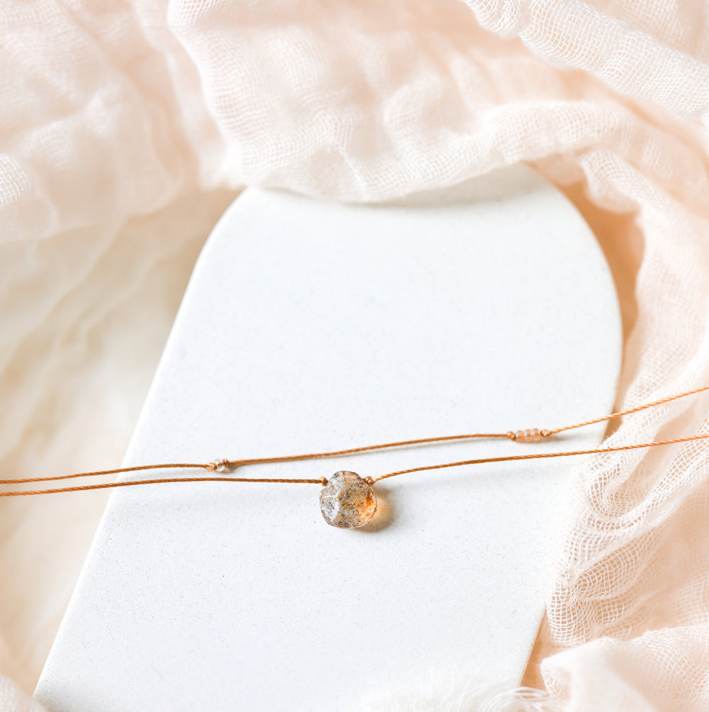 This double layered choker necklace features a rustic brown faceted teardrop pendant with a silvery dust finish on our chestnut waterproof cord. Tiny beige and mocha brown glass seed beads accent the upper strand. Elevates any earthy boho look.