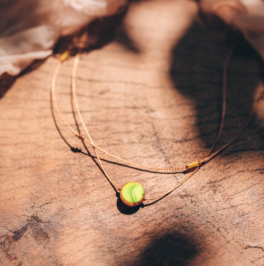 This double layered choker necklace features a vibrant lime yellow glass coin pendant with rustic brown edging on our dainty waterproof cord. Tiny yellow and bronze glass beads accent the upper strand, adding that eclectic boho touch.