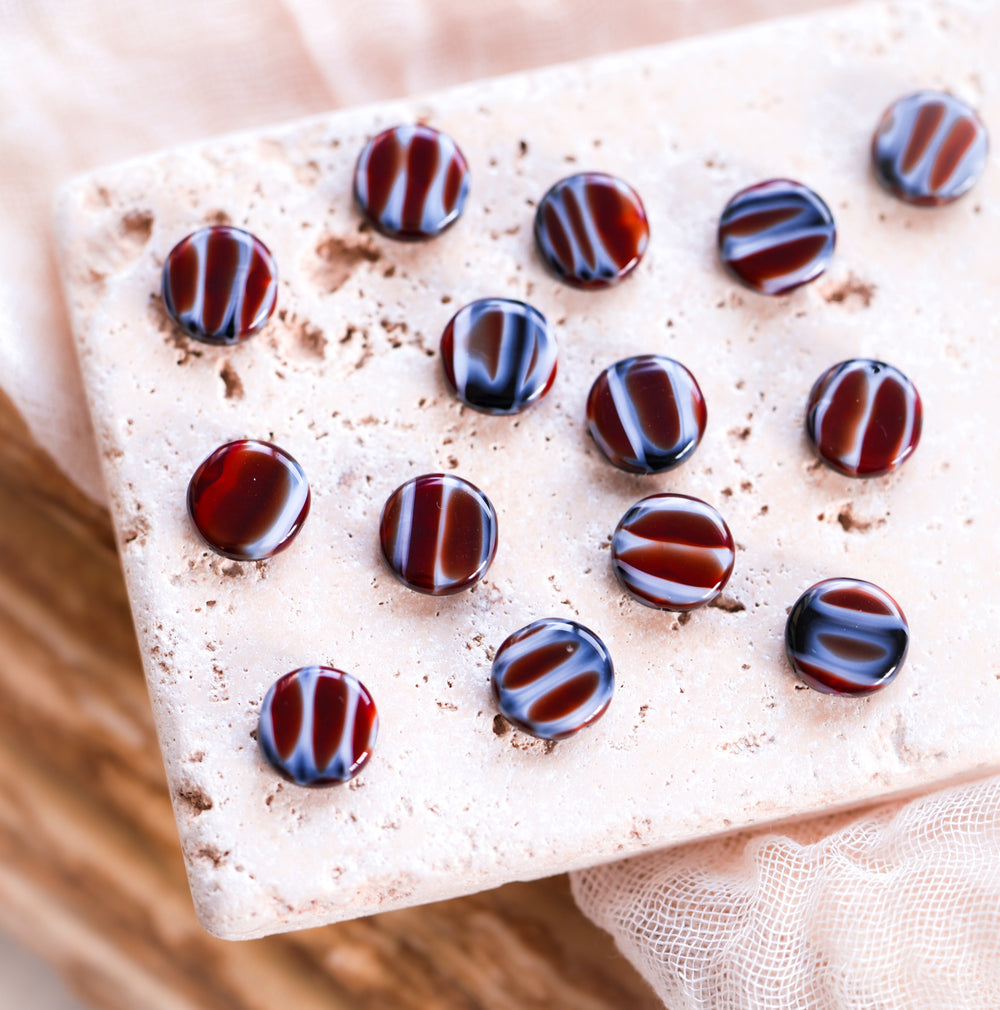 Say hello to the STRATA necklace, where structure meets free expression, blending hippie and modern vibes. This double layered choker necklace features a unique tie-dye striped pattern on a glass disc pendant with stunning hues of blue and deep red. Accented with tiny seed beads along the strand, it's the perfect go-to piece for your next adventure.