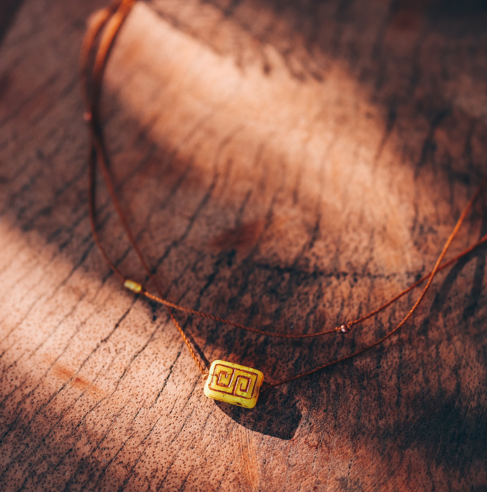 Super cute and rustic, this layered choker necklace is a standout addition to your jewelry collection. It features a striking rustic glass focal pendant that showcases a tribal/Aztec design centered on our chestnut brown waterproof cord. Elegantly knotted along the length of the strand, you'll find tiny yellow and copper-colored glass seed beads that add an eclectic charm. This lovely piece is perfect for elevating your bohemian-hippie chic style.