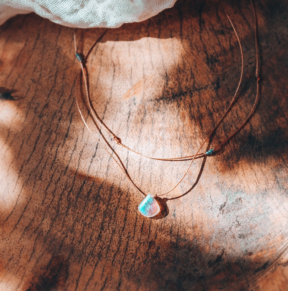 Check out this magical whimsy double layered necklace featuring a mesmerizing glass teardrop pendant that shimmers in the light, revealing a prism of iridescent blues, greens, pinks, oranges, and golden hues. It's beautifully complemented by dainty blue and blush seed beads knotted along the choker strands. Crafted with our waterproof cord, this delicate choker is the quintessential accessory for any bohemian or hippie inspired outfit.