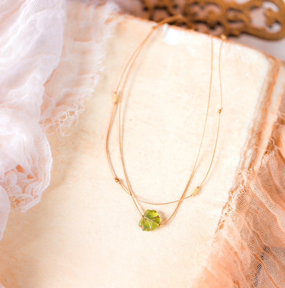 Check out this classic double layered hippie choker necklace. It features a gorgeous glass green leaf charm that’s finished with a lovely gold dusting, all carefully strung on a golden waterproof cord. Along the length of the necklace, tiny golden seed beads are delicately knotted, adding a whimsical touch. This piece is perfect for bringing a subtle hint of cottagecore vibes and a laid-back hippie aesthetic to your style!